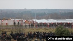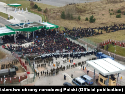Белорусская служба Радио Свобода сообщает, что к КПП мигранты шли в сопровождении белорусских силовиков с оружием в руках: